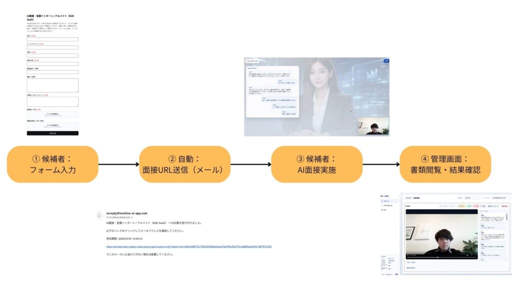 - 候補者がフォーム入力 → AI面接URLを自動送信(手動送付の運用を廃止)